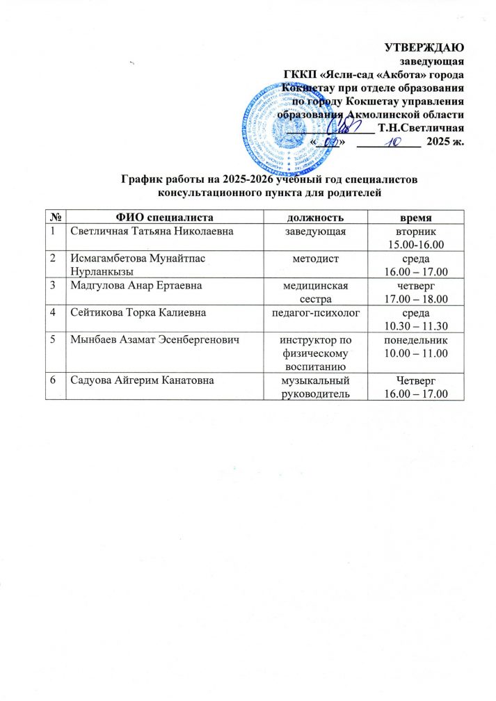 Ата-аналарға арналған консультациялық пункт мамандарының 2025-2026 оқу жылына жұмыс кестесі
