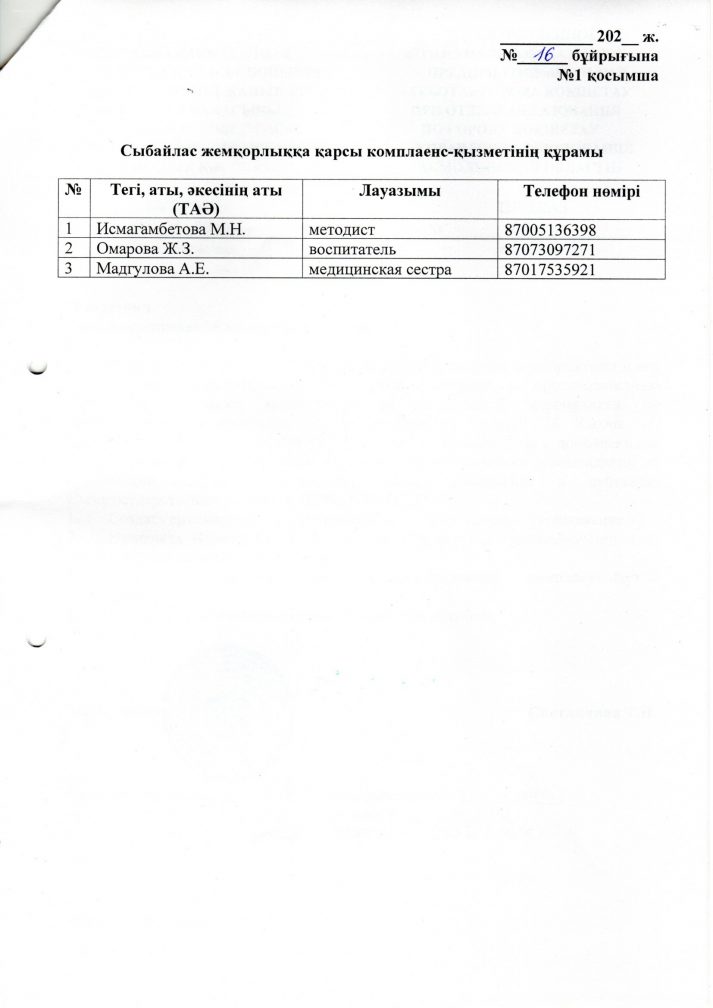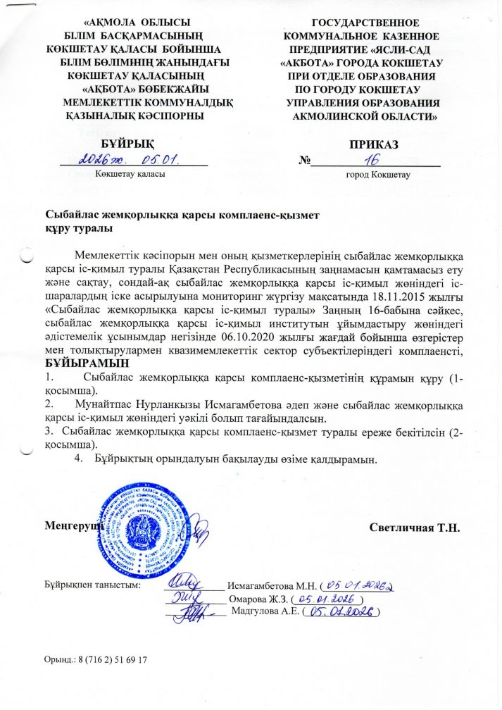 Сыбайлас жемқорлыққа қарсы комплаенс-қызмет кұру туралы бұйрық