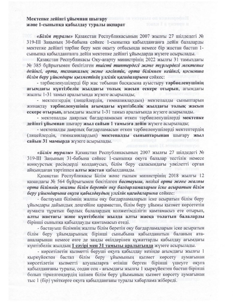 Мектепке дейінгі ұйымнан шығару және 1-сыныпқа қабылдау туралы ақпарат
